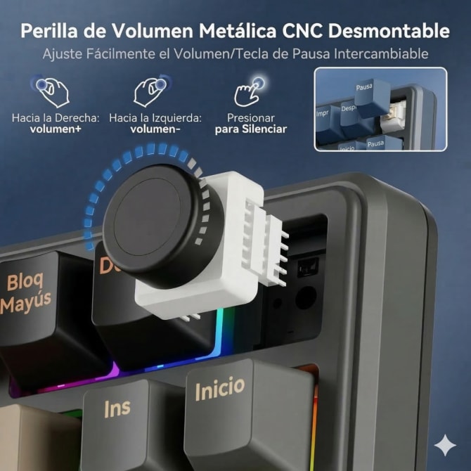 Perilla: Control de volumen en aluminio CNC (detachable e intercambiable).