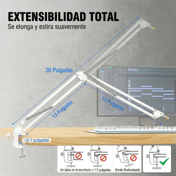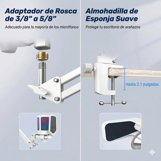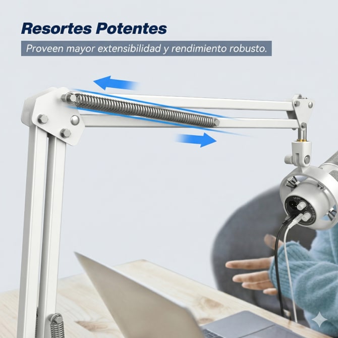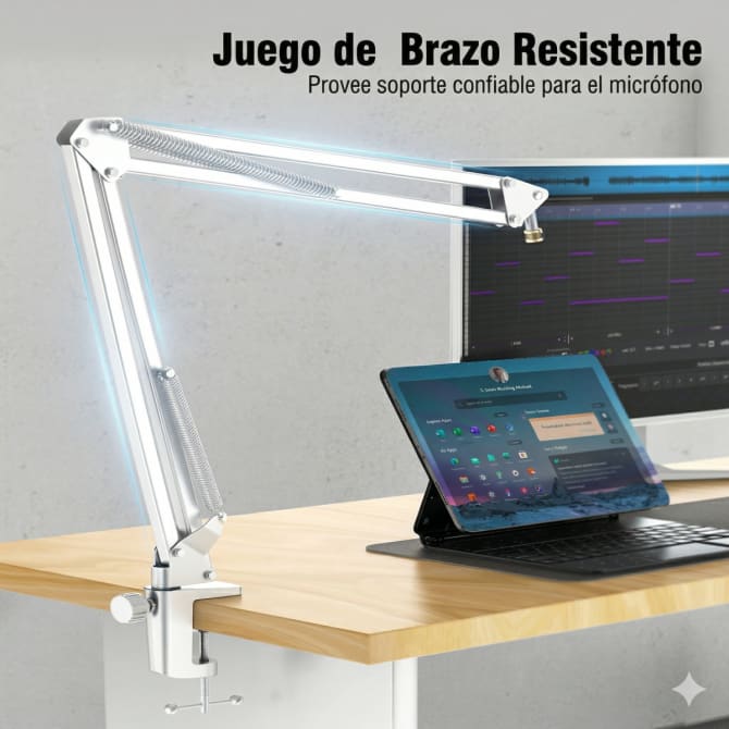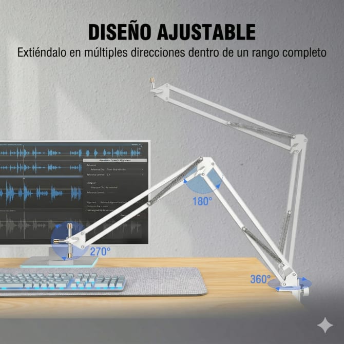 Uso: Optimización de espacio en escritorio y posicionamiento de micrófono.