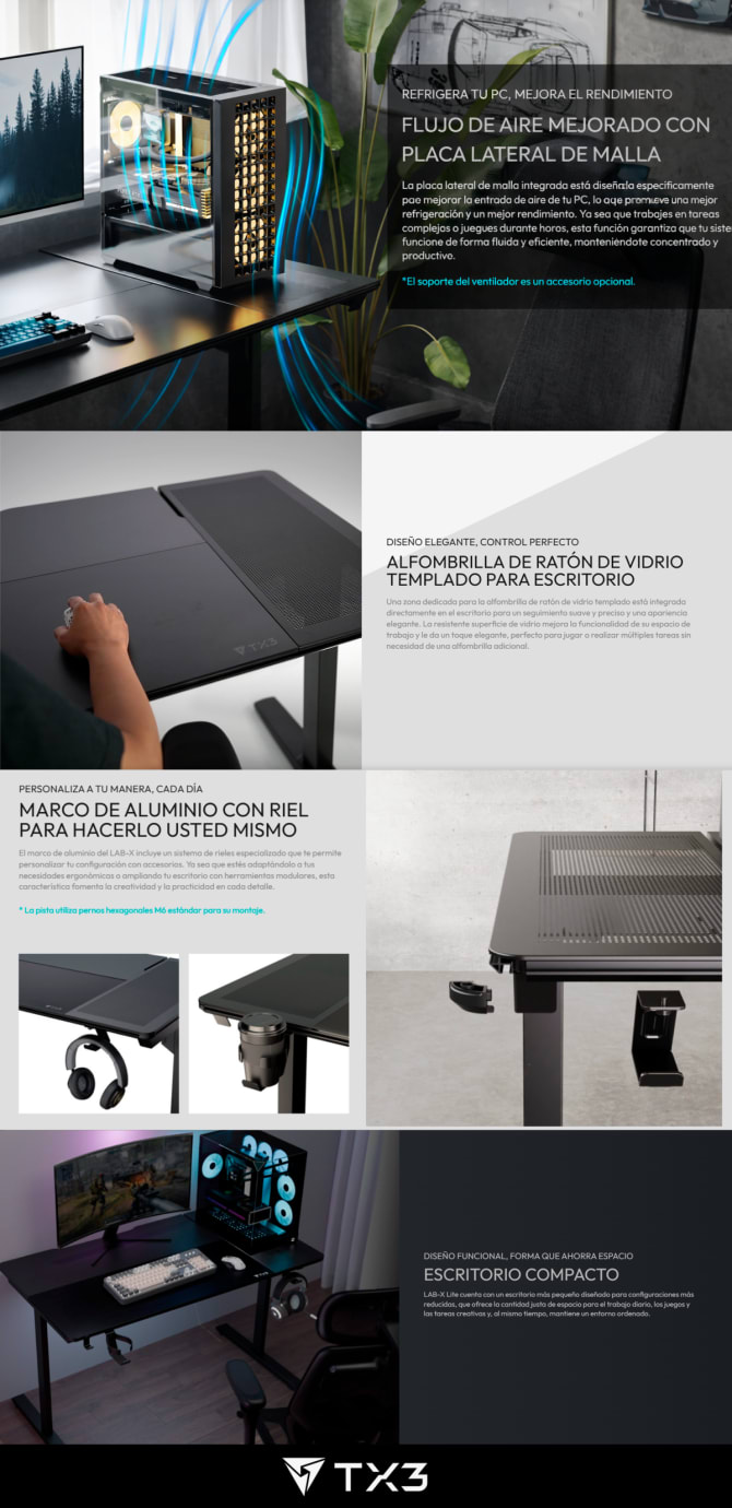 Un escritorio gaming compacto y ergonómico, con superficie de vidrio templado para mousepad y placas laterales de malla que mejoran la ventilación del PC. Su estructura de aluminio con rieles DIY permite una fácil personalización, mientras que su diseño de escritorio de pie promueve una mejor postura. Ideal para gamers, creadores y profesionales que buscan máximo rendimiento en un formato reducido.
