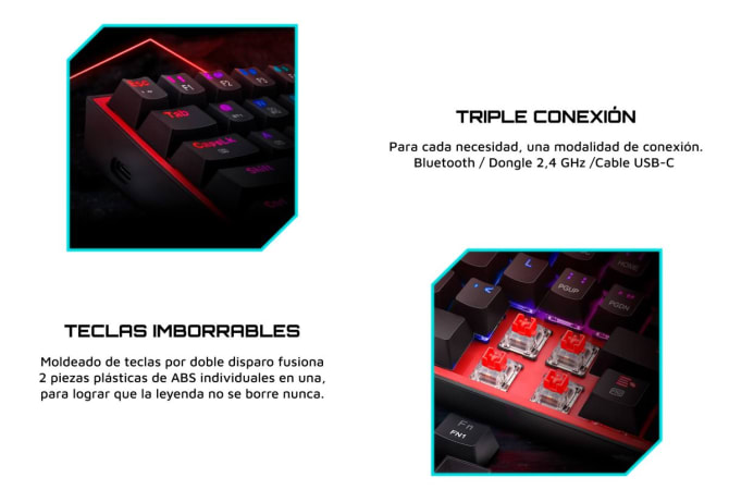Switches: Intercambiables Redragon Red MK2, lineales sin clic audible y fuerza de actuación de 45 g.