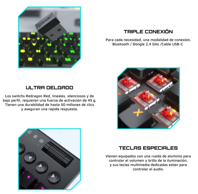 Tipo de switch: Redragon Red Ultra low profile, lineal, fuerza de actuación de 45 g.