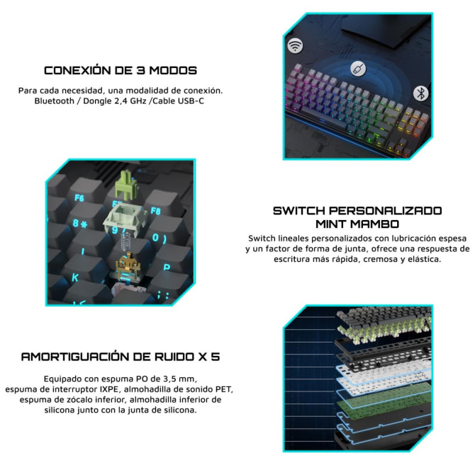 Conectividad: 2.4 GHz, Bluetooth y USB-C con cable.