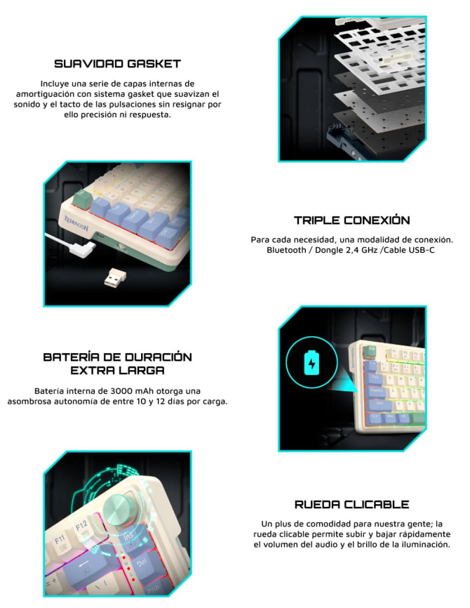 Construcción: Plástico ABS reforzado y teclas de PBT moldeadas por inyección de doble disparo para durabilidad y estilo.