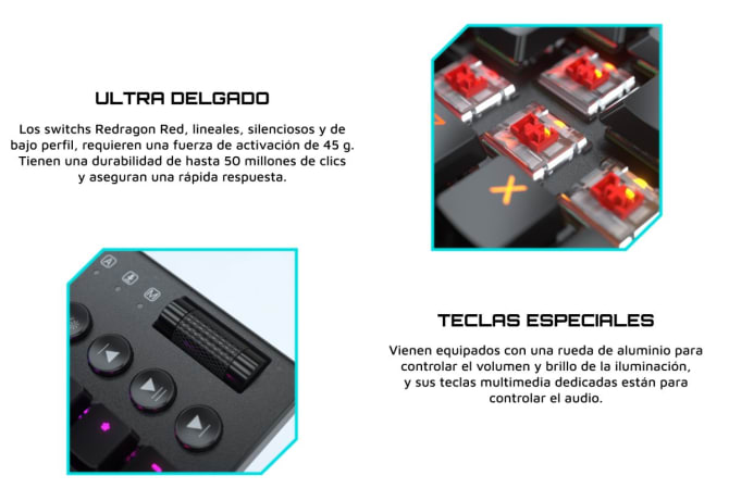 Tipo Switch: Redragon Red Ultra low profile, lineal, fuerza de actuación 45 gr