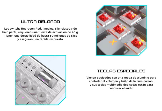 Tipo Switch: Redragon Red Ultra low profile, lineal, fuerza de actuación 45 gr